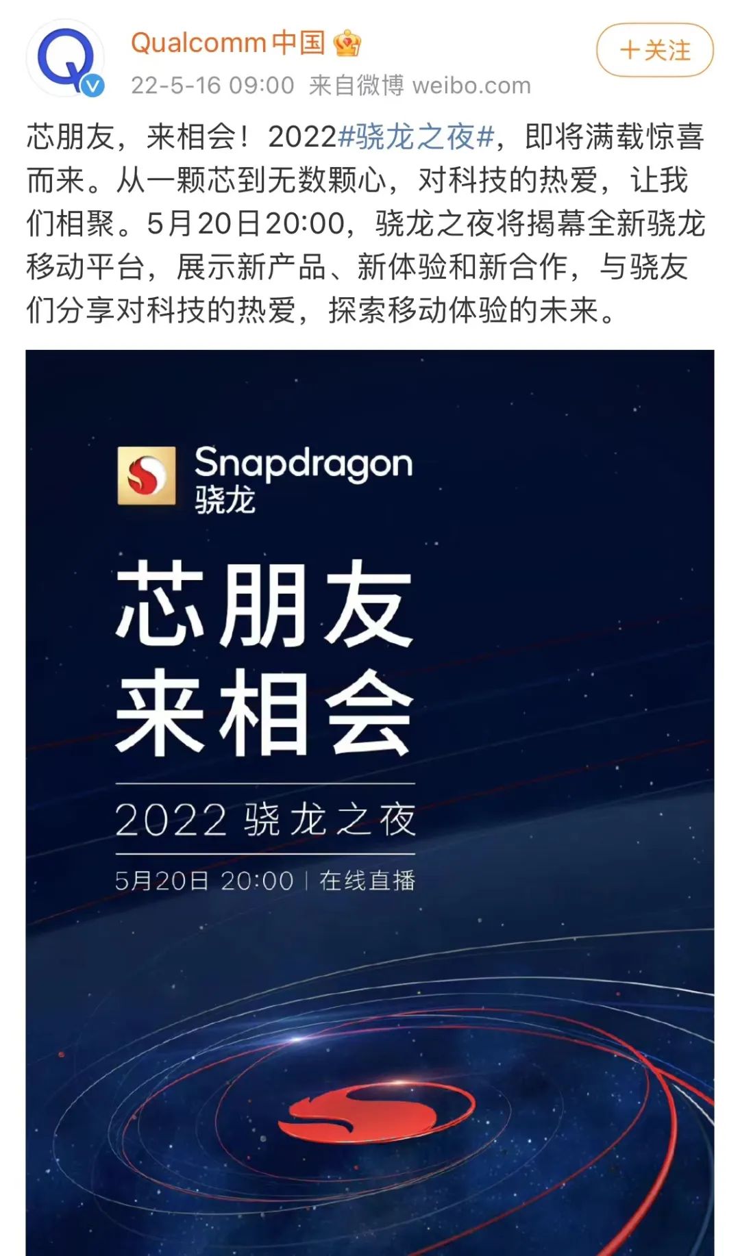 5月16日,@Qualcomm中国发文预告“2022 骁龙之夜”的直播信息,邀约行业人士及骁友们共同观看。