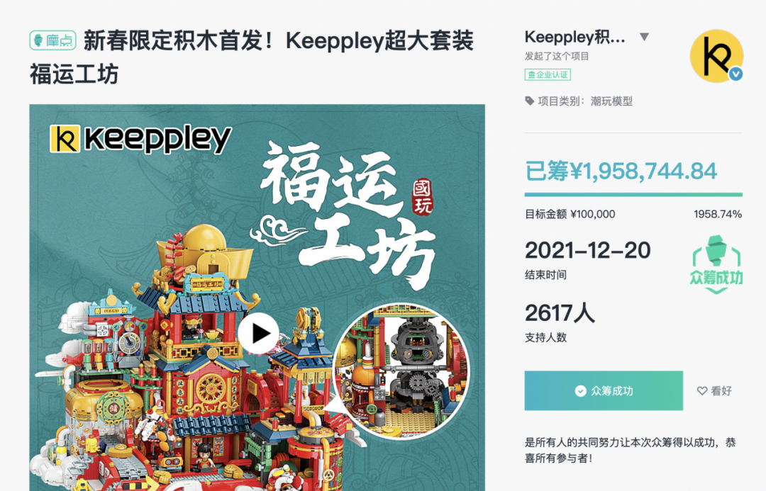 记者登录该众筹平台“摩点”看到,2021年11月15日,Keeppley在摩点上线了该众筹项目进行预热,并于11月30日正式启动众筹,上线半小时即完成了10万元的目标金额。截至12月20日众筹结束,该产品总众筹金额高达1958744.84元,共计2617位消费者支持,为10万元目标筹款金额的19倍!